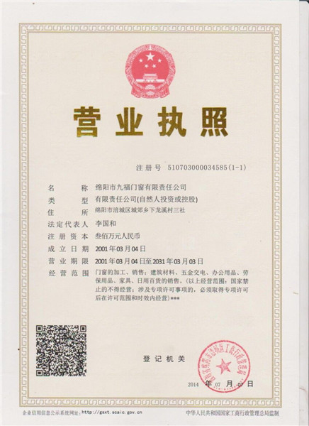 綿陽市九福門窗有限責任公司座落于中國西部美麗的科技城----綿陽。是川內研發(fā)生產新型換代,生態(tài)環(huán)保室內門和家具的企業之一。我公司生產的產品,綠色環(huán)保、堅固耐磨,抗擊性高、防潮阻燃、不含苯、不變形,連續(xù)六年經四川省綿陽市質量技術監(jiān)督局抽檢合格,符合中華人民共和國行業標準的各項要求。2011年,被中國產品培育委員會和中國品牌調查統計中心推介為《質量·服務·信譽AAA企業》、《中國綠色環(huán)保產品》和《誠信經營、消費者滿意產品》;注冊商標“金九福”牌系列產品,在全國品牌評選推廣活動中,經中國品牌認證委員會和中國產品質量評選中心審核,于2012年2月入選為《中國****品牌》…>>更多 |